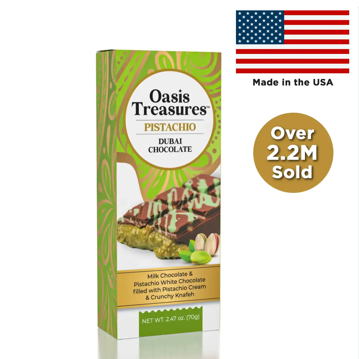 The Oasis Treasures Dubai Pistachio Chocolate Bar is a viral sensation that continues to fly off shelves nationwide. Each bar is 70g (2.45 oz) of rich milk chocolate, creamy pistachio-infused white chocolate, and a crunchy, golden knafeh center — all handcrafted right here in the USA.